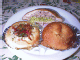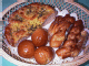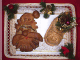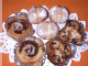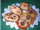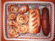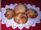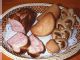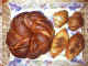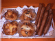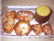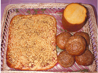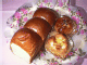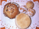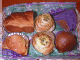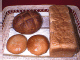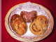 左:ストロイゼル クーヘン 薄いパン生地の上に、 クッキーのような 生地を載せて (ボロボロに、崩しながら 載せます。)焼きました。 間にイチゴジャムを、 はさみました。 右上:パンプキンブレッド 生地にかぼちゃが 練り混んであります。 メッシュ型で焼きました。 右下:胚芽ブレッド (ごまロール) 小麦胚芽を使った生地に ごまをたくさん載せて 焼きました。とても ヘルシーなパンです。 |