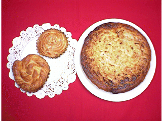 右:オニオンタルト サワークリームと、玉ねぎが、たくさん入った卵を、 パン生地で作った型に入れて、ふわふわに 焼き上げました。 切り取った写真です。 クリックすると、大きいのが、見られます。 左:デニッシュペストリー 生地を、何回も伸ばしては、折りたたんだ、 デニッシュパンです。砂糖を、まぶしてあります。 2種類のかたちに、作りました。 上の小さい方には、スライスアーモンドも 載っています。