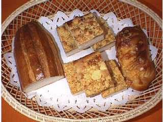 左:サブマリン 卵白だけを使った、白いパンです。潜水艦のような形に 出来るのでサブマリンです。写真は半分に切ったところです。 中央:ストロイゼル クーヘン2種 薄いパン生地の上に、クッキーのような生地を載せて (ボロボロに、崩しながら載せます。)焼きました。 間にイチゴジャムと、ももジャムを、はさみました。 右:ウィンナー チーズ ロール 中に、大きなウィンナーと、スティック状のチーズを入れ、 マヨネーズとチーズをかけて、焼きました。
