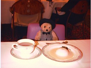 お食事の時間。 ぷりんちゃんも、きちんと 蝶ネクタイで、正装です。 「きょうのデザートは、 サクランボのムースだよ。」 |