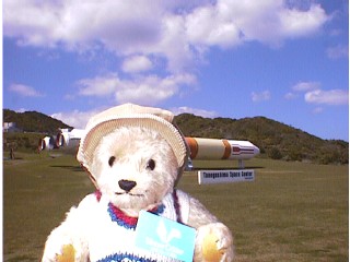 宇宙科学館の前で。 「おおきなロケットだね。」 |
