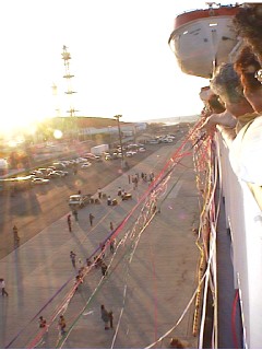 みんなでテープを投げて、 いよいよ出航です。 「いってきまーす。」 |