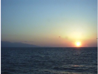東シナ海に沈む夕日。 左の島影は屋久島です。 |