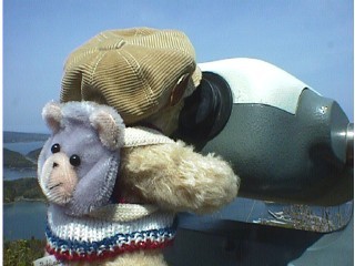山の上の展望台。 ぷりんちゃんは、 望遠鏡を覗いています。 「なにが、みえるかな。」 |