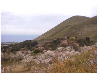 鬼岳。芝生に覆われた きれいな山です。 麓に桜がたくさん 咲いていました。 |