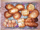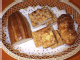 左:ストロイゼル クーヘン 薄いパン生地の上に、 クッキーのような 生地を載せて (ボロボロに、崩しながら 載せます。)焼きました。 間にイチゴジャムを、 はさみました。 右上:パンプキンブレッド 生地にかぼちゃが 練り混んであります。 メッシュ型で焼きました。 右下:胚芽ブレッド (ごまロール) 小麦胚芽を使った生地に ごまをたくさん載せて 焼きました。とても ヘルシーなパンです。 |