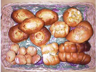 右:調理パン5種 上から、コーンマヨネーズ、チーズハムロール ポテトサラダ、ベーコンロール、ソーセージロール 左上:ノースバンズ クリームチーズと、オレンジソースが、 入っています。 左下:ポン・デ・ケージョ チーズが、たくさん入った生地で作ります。 お餅のような、モチモチした食感が特徴です。